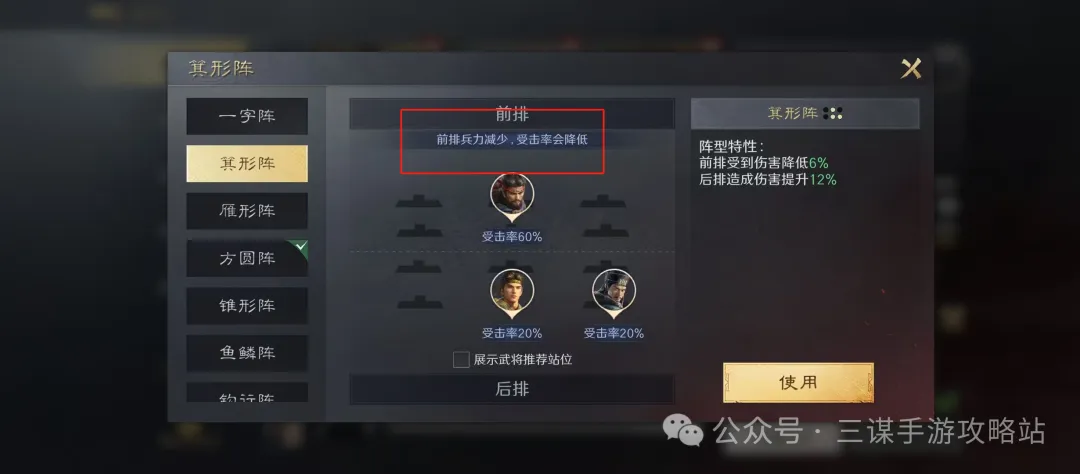 箕型阵有两大效果,前排受到伤害降低,后排造成伤害提升。