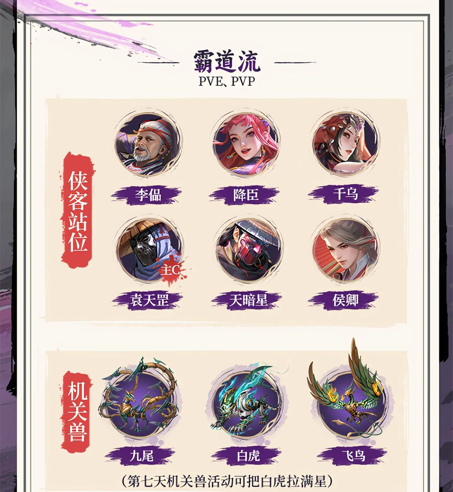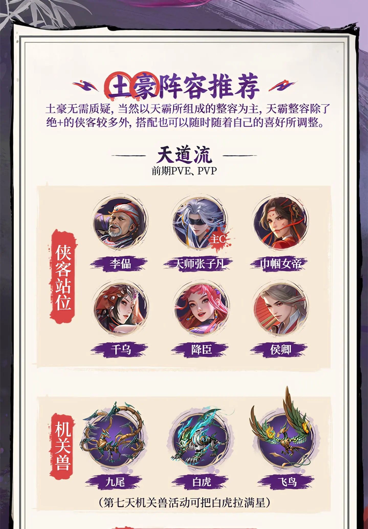 土豪无需质疑,当然以天霸所组成的整容为主,天霸整容除了绝+的侠客较多外,搭配也可以随时随着自己的喜好所调整。