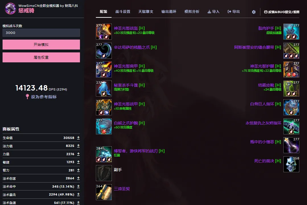 我们通过新手盒子自带的“WowSimsCN怀旧服模拟器”来进行伤害模拟,在P4全毕业状态下惩戒骑的单体DPS输出。