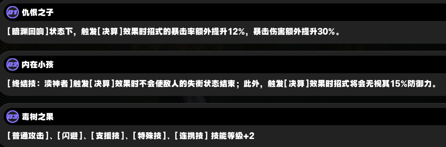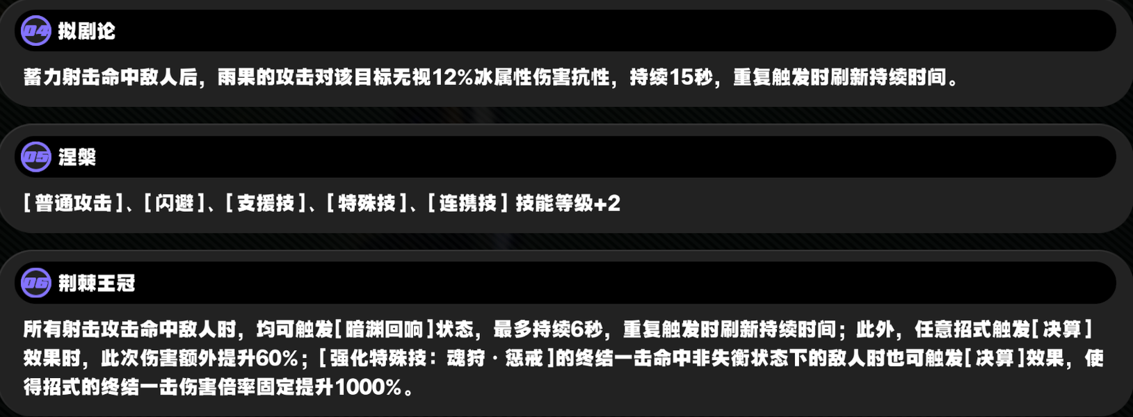 一画和二画算是比较关键的影画。前者的高暴击率可以让雨果凹暴伤词条的底气,后者主要是可以打出QE双决算,也就是打两个大数字。不过并不是每一轮失衡都可以打出QE,主要还是有大招的击破队友失衡速度太快了,雨果大招都还没充满。