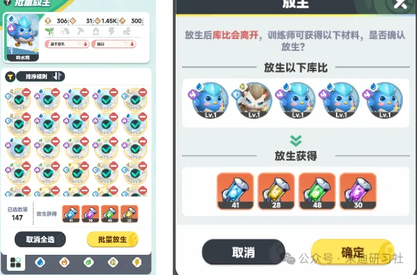 通过日常开蛋等渠道我们会得到许多蓝色库比,而到了游戏中后期,蓝色库比的打工能力和打架能力都太弱,基本已经用不上了。这时候我们可以批量放生蓝色库比(未升星),获取大量的进化道具来培养咱们的主力库比。