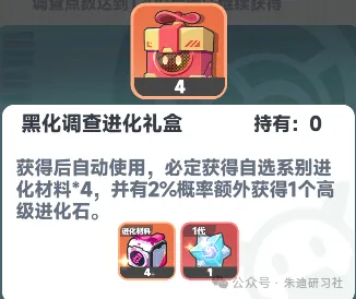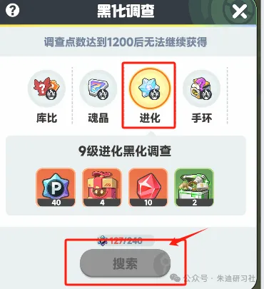 新大陆调查点数足够时可以开启黑化调查搜索,完成黑化调查后可以获得进化礼盒。
