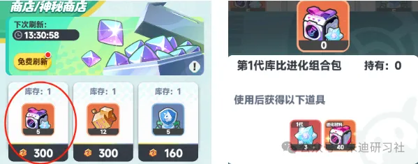 打开商店中的神秘商店,花费300神秘徽章可以购买5个进化组合礼包。