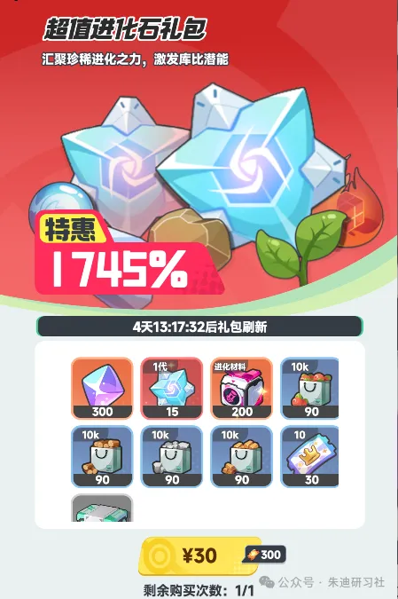 游戏左上角,点击商城就能购买进化石礼包,30r可以买到15个进化石+200普通进化材料,还有一大堆普通物资。要是这杂七杂八的附赠品不算,单看进化石的话也就是2r一颗。