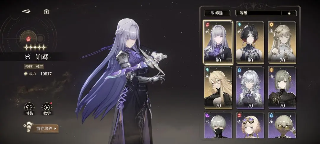 1、配队公式:主c+辅助+破势,比如铂鸢+郝菲+萝歌丝