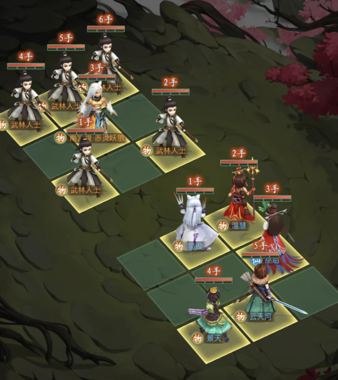 云天河放8号位,云天河绝技“恸天贯日式”对纵列造成伤害并有概率附加定状态,放这里不仅可以直接打到南宫煌,绝技还可以清理同列武林人士,一定程度上提高了容错率,若对目标造成定状态,则进一步提升伙伴的生存空间。
