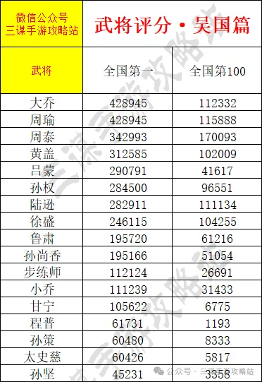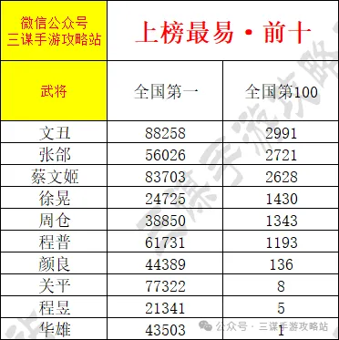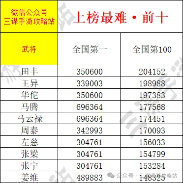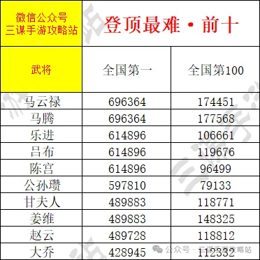 这个表里是全国前100里最低分最高的10位武将,都是使用非常多的武将,想要拿到全国排名非常难。