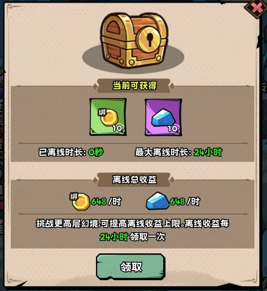 ·幻境宝箱产出的奖励达到2小时后可进行领取,最大离线产出时长为24小时,当超过24小时未领取宝箱奖励,则停止产出。