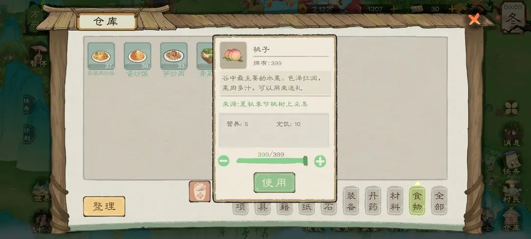 这时我们就拥有了400个桃子,这桃子可以直接吃的,我们打开仓库,点击使用食物食用桃子,直接拉满,把桃子全吃了,当然,你也可以省着吃,把桃子放上家宴啥的