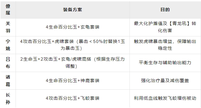 常规4神鹿+4百分比生命加成的宝玉即可,神鹿4件套提升的生命值更高。关羽的护盾被打破会造成关羽已损失生命值的伤害,所以需要刻意去掉血提升盾爆炸后的伤害,因此关羽不需要有太高的格挡和防御值,纯堆血量即可。