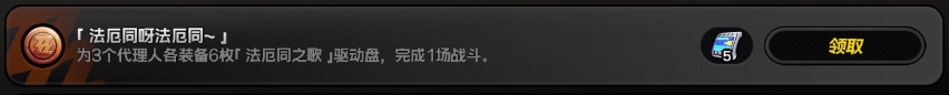 为3个代理人各装备6枚「法厄同之歌」驱动盘,完成1场战斗。
