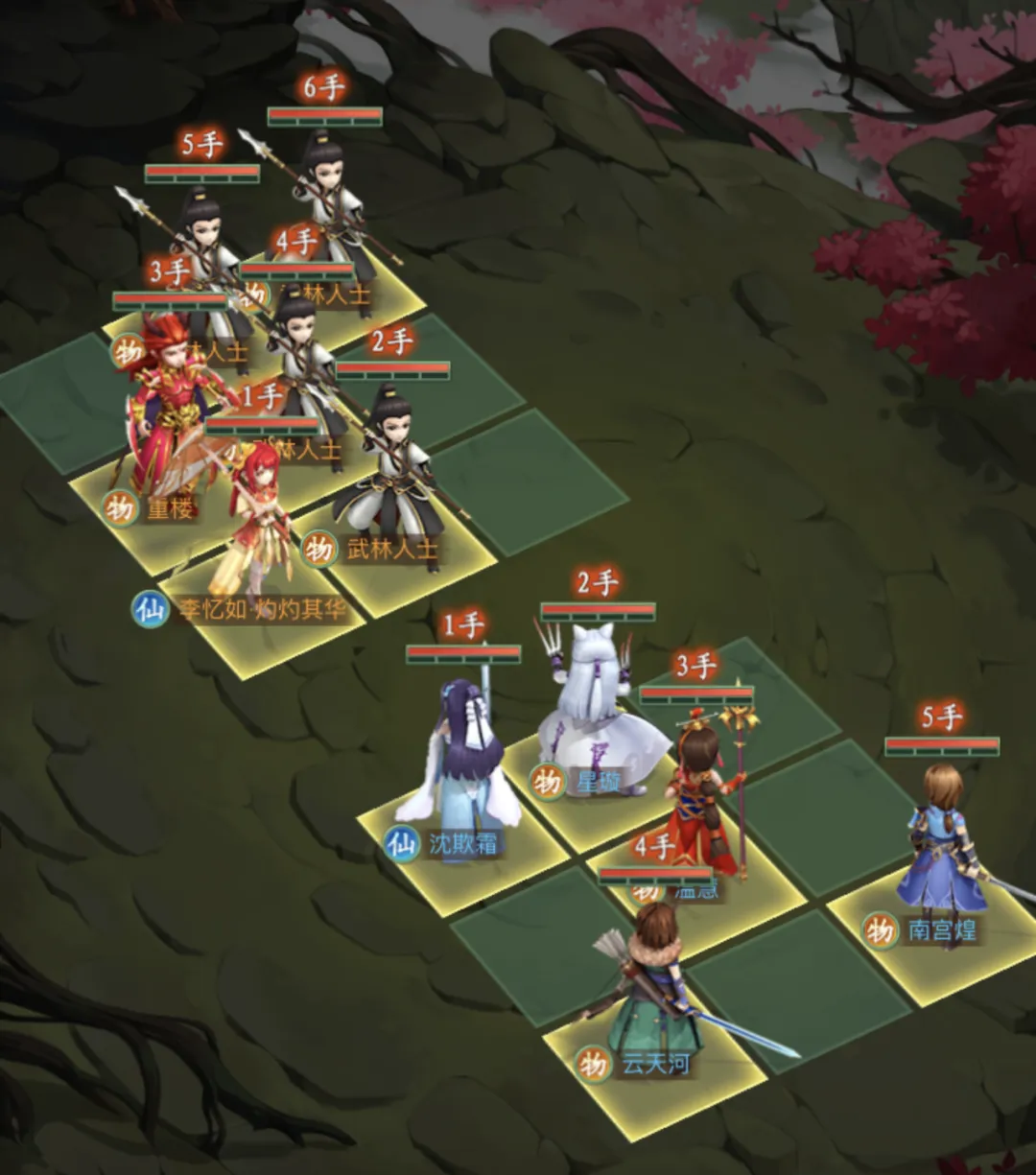 沈欺霜放1号位,沈欺霜绝技“白虹贯日”提供高额单点输出的同时,对目标周围附加一定仙术伤害,因敌方李忆如·灼灼其华的存在,因此要先手于李忆如,避免她给自身附加“女娲之心”(免仙伤的基础上,还要再转精力)导致打不出伤害,因此沈欺霜要放1手,使其输出最大化。