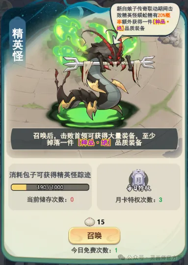 联动期间,击败精英怪“蜈蚣精”,有20%概率可多获得一件最高品质装备!