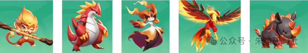 1、阵容1:焰羽猴+炎甲兽+妖焱狐+朱雀+熔岩犀