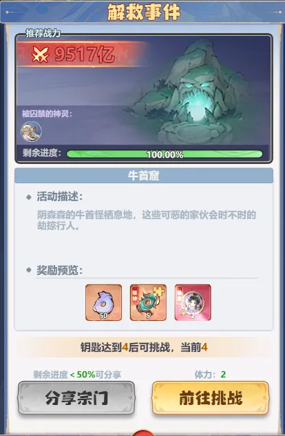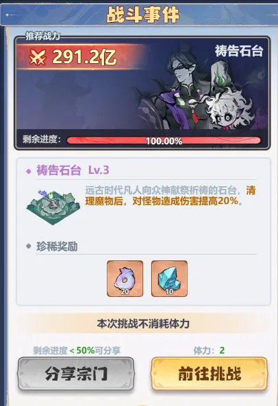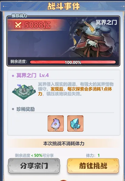 注意:战斗可分享至宗门求助,战力低的道友建议要积极到宗门摇人协助,每人仅能协助同一副本1次,战斗中不可中途加入。