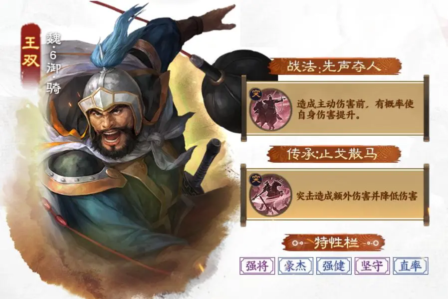 王双本身是一个6御的骑兵,和昨天预想的那样就是对魏骑的补强,主要问题还是看数值给得怎么样了。传承战法是老战法止戈散马,就不多提了。