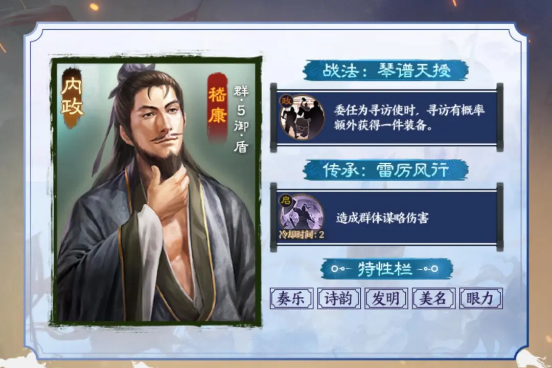 嵇康,战法琴谱天授,委任为寻访使时,寻访有概率额外获得一件装备。