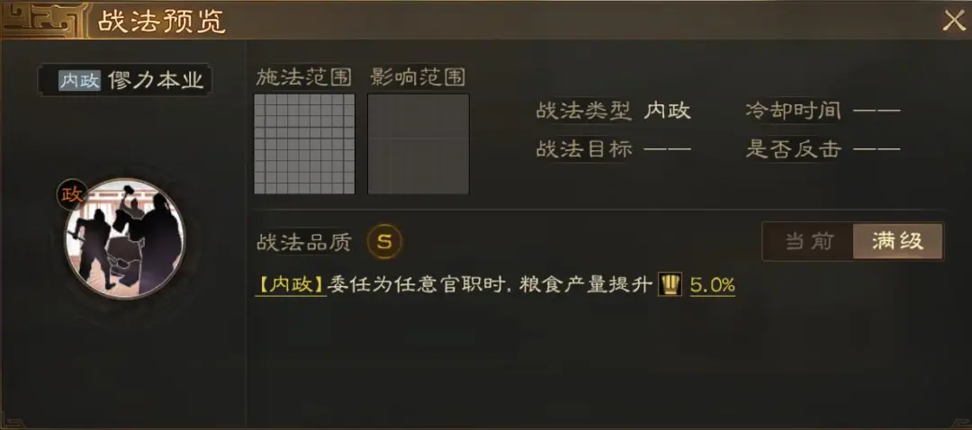 这个战法让携带者变成刘备,直接能自动分摊一个友军的伤害,还有移动力提升(刘备是治疗和全属性)。而且还有一个提升自身免伤的效果,目测免伤数值应该在10%-16%之间,分摊40%-50%之间,移动力估计是+1。
