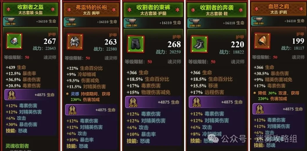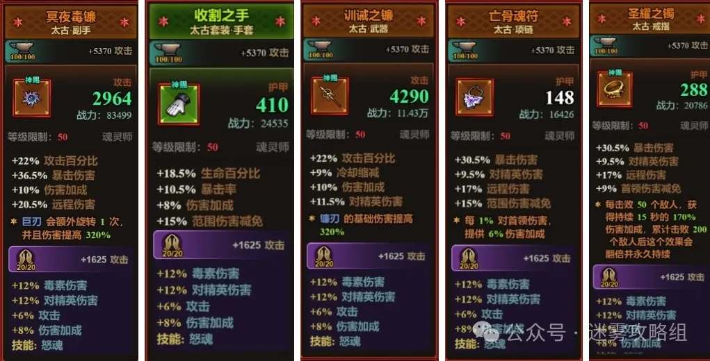 魂灵师毒镰神铸技能都是怒魂(对精英伤害高于60%时,每高2%则获得3.2%伤害加成),精英伤害加成比元素要高一些,而且要想神铸发挥作用,精英加成必须要高,所以所有装备的神铸就需要洗对精英伤害词条,包括装备基础词条,才能保证怒魂发挥效果,毕业的精英伤大概在184,各位玩家可以看看。