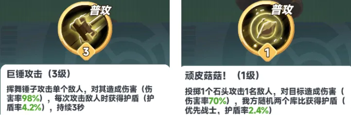 普攻:大锤和蘑菇普攻全部自带护盾,一个给自己盾,一个给队友盾。