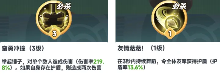 必杀:大锤如果自身有盾,必杀对敌人造成2次伤害。而蘑菇是给队友套盾。