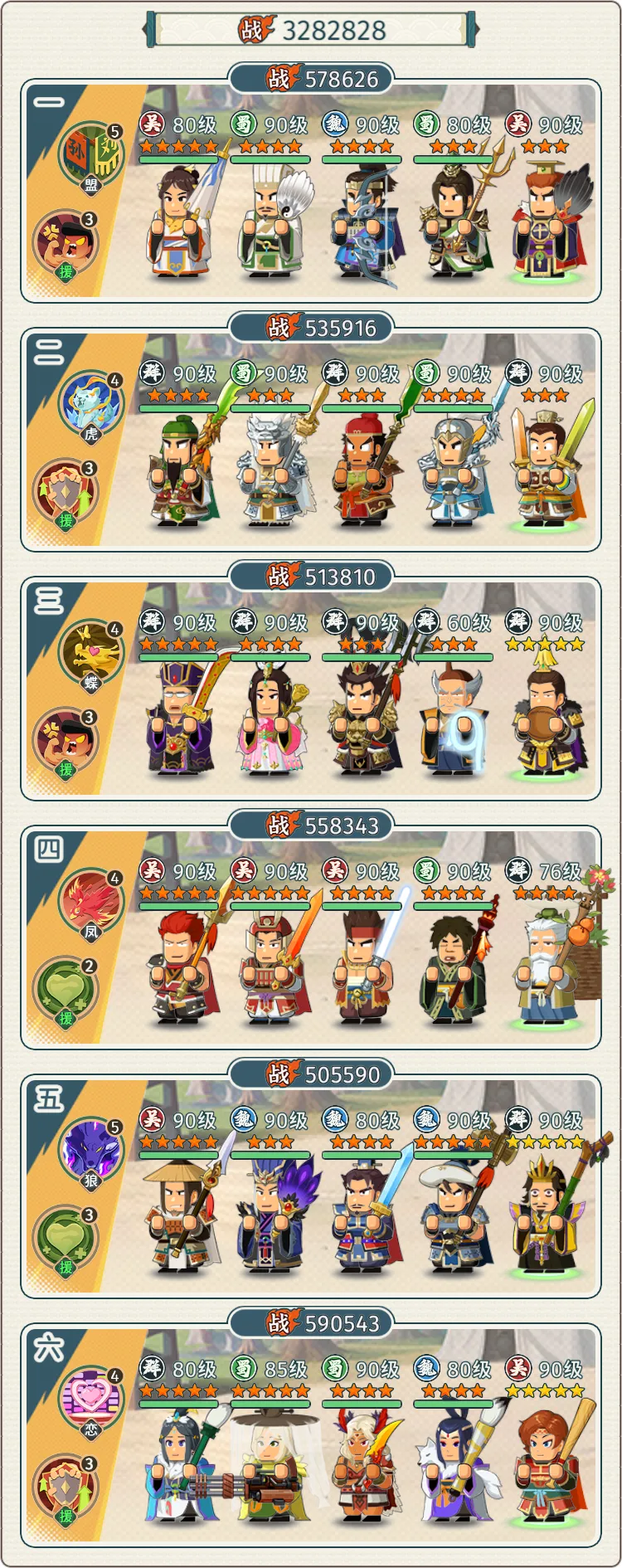 五虎的名字就已经告诉我们怎么来配队了,要么五虎齐全,要么四虎+优质援助。因此我们将酒关羽召回。
