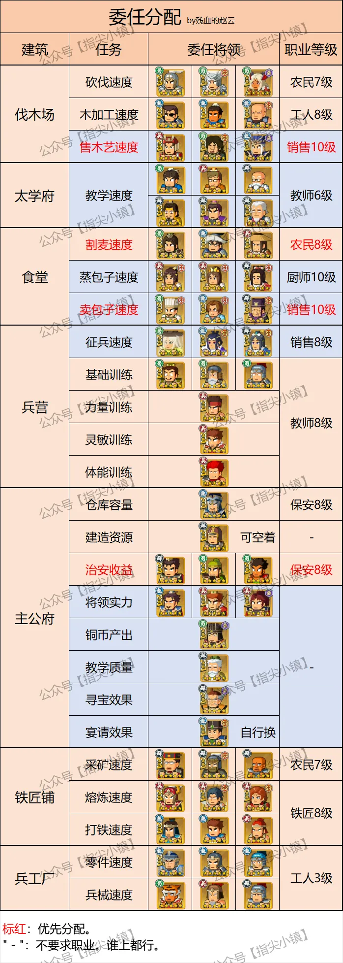 因此各位主公在分配委任时,可以优先考虑将这些位置拉满,剩下的按照现有将领具图分配即可。