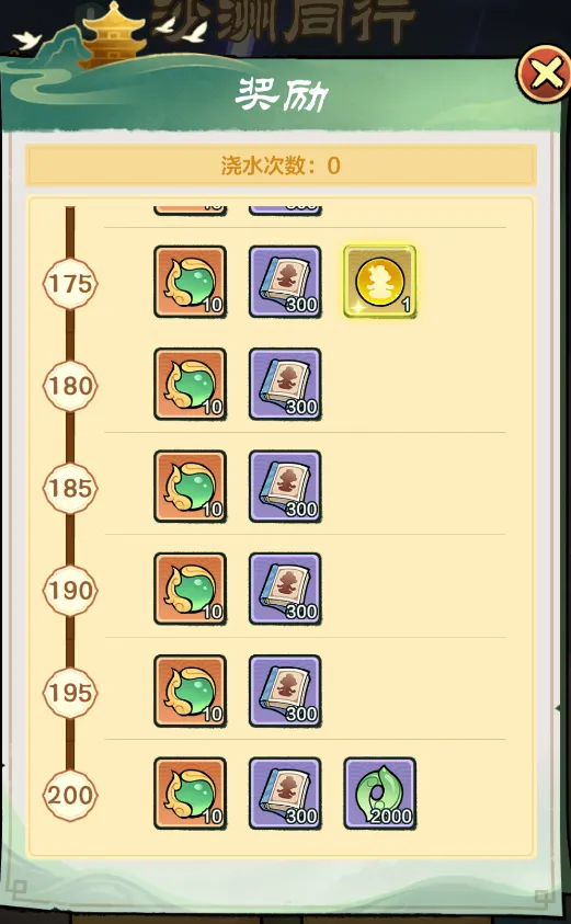 除神树成长值奖励外,个人浇水达到一定次数,也可获得额外海量【灵玉】、【自选心得】、【坐骑灵露】及【驭灵珠】【历练值】【招募令】奖励。