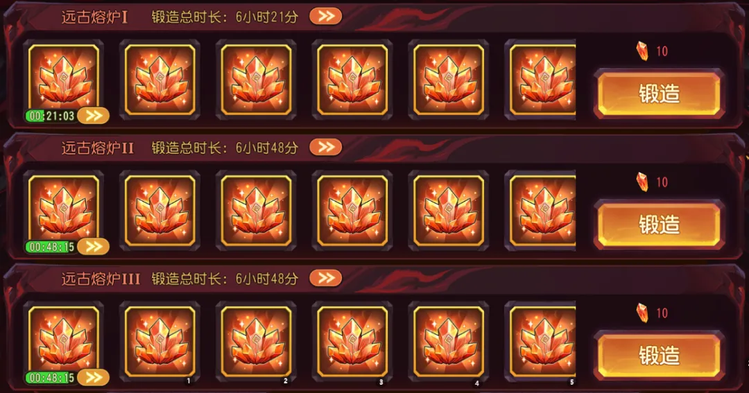 3、至于锻造加速,可用可不用,新系统上线会送不少,想加速就加速。可以稍微留一部分用在,睡觉前加速掉还没锻造完的格子,重新进一个满CD即可。千万别用钻石加速,也别花资源去兑换加速燃料,后面赤晶都不够了谁还加速呢?纯纯的智商税。