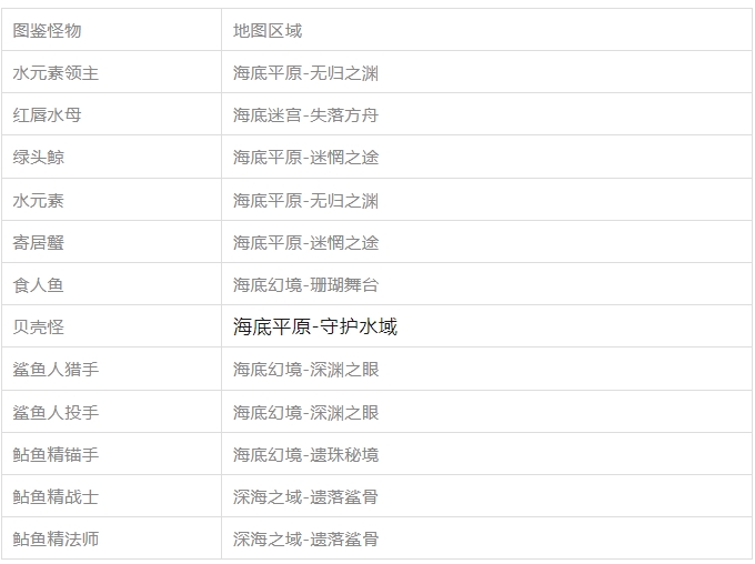 新开放的海底迷宫图鉴,试过了除了贝壳怪外的所有图鉴怪,且新地图和老地图均有尝试,仅掉落解锁了水元素领主和红唇水母。