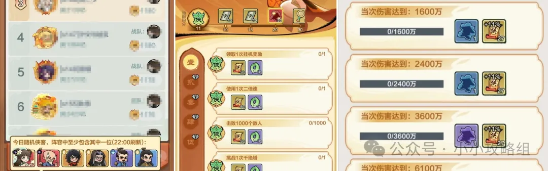 ·为侠出征:三名大侠组队进行挑战BOSS,有伤害要求,大家只需打满即可,不用强求。