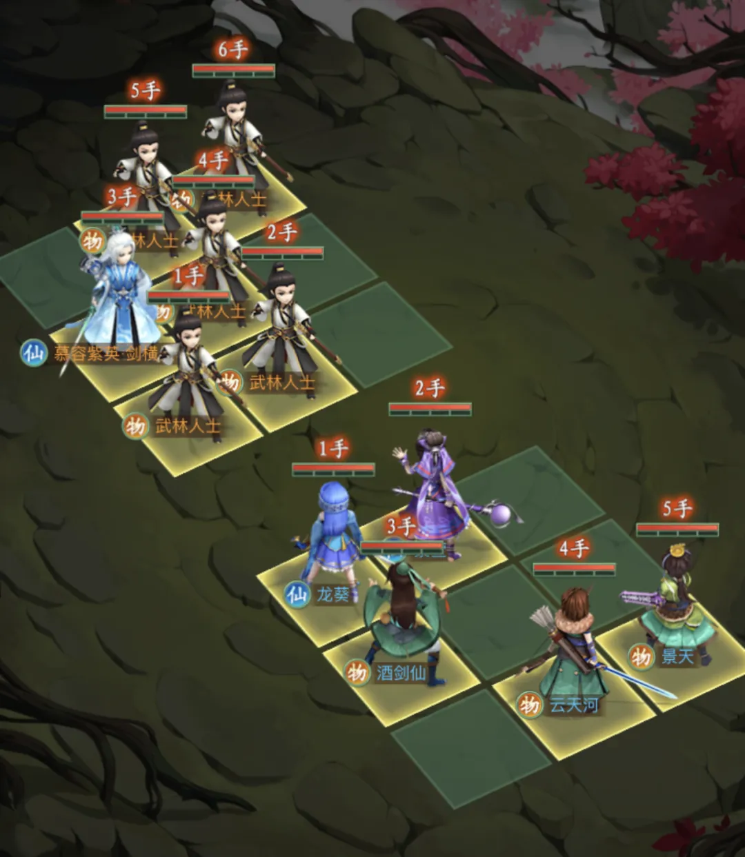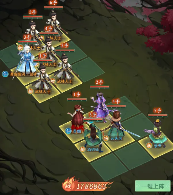 云天河放8号位,云天河绝技“恸天贯日式”对纵列造成伤害并有概率附加定状态,放这里不仅可以压低中间武林人士血量,若对目标造成定状态,则进一步提升伙伴的生存空间,也便于触发景天的被动“追凶魂剑”因此,要先手于景天。