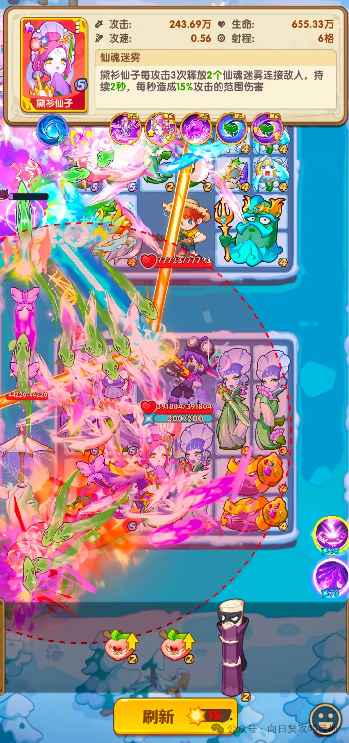 然后重新上场,再次达到5羁绊的状态。此时,瞬时BUFF加成将被应用到所有植物上,攻击力显著提升,如第二张图所示。