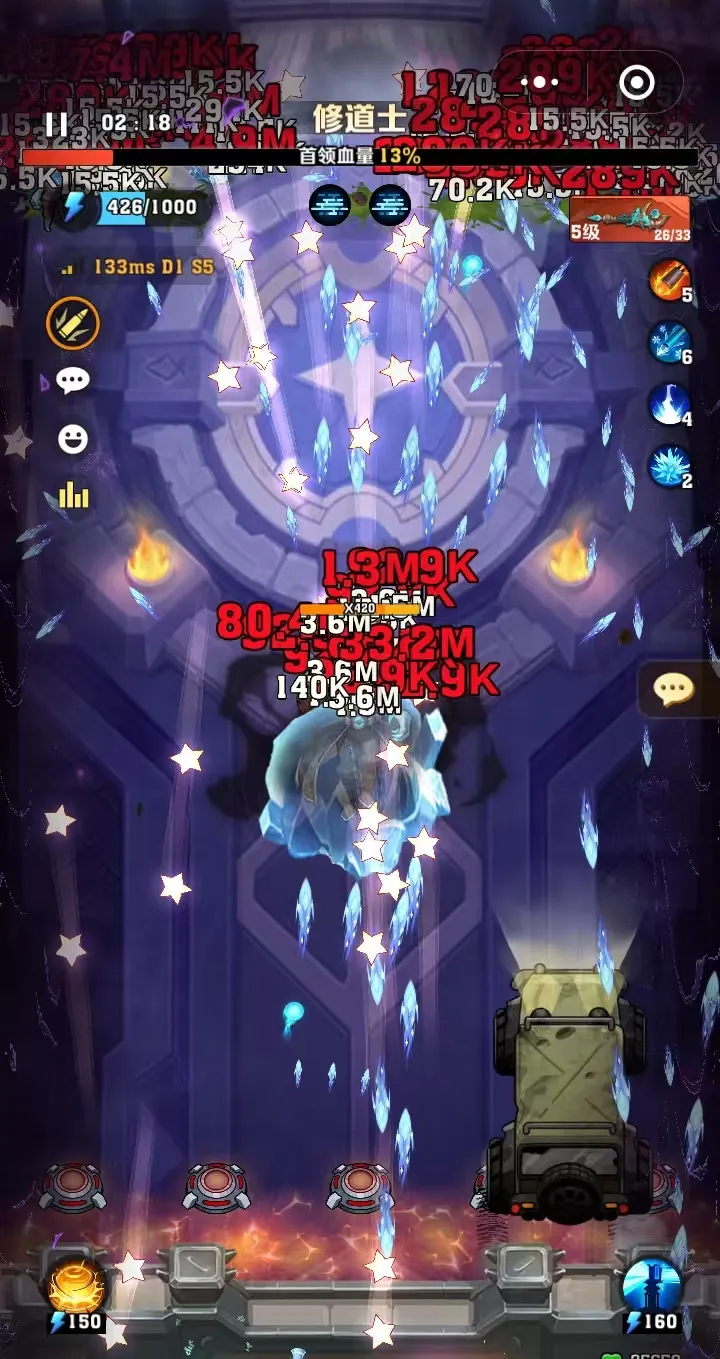 游戏前期子弹加技能打到100关,100-220是百分比的天下,大后期子弹是唯一真神。