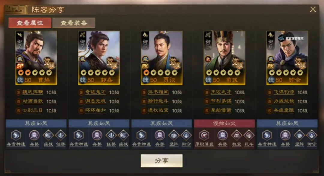 钟会和贾诩两个工具人都非常顶级,一个封被动,一个控制敌人,能给郭嘉和SP曹操创造输出机会。SP曹操单点,郭嘉群攻,以进攻代替防守的队伍,基本上就靠钟会的力战抗敌和兵疲意阻保命。