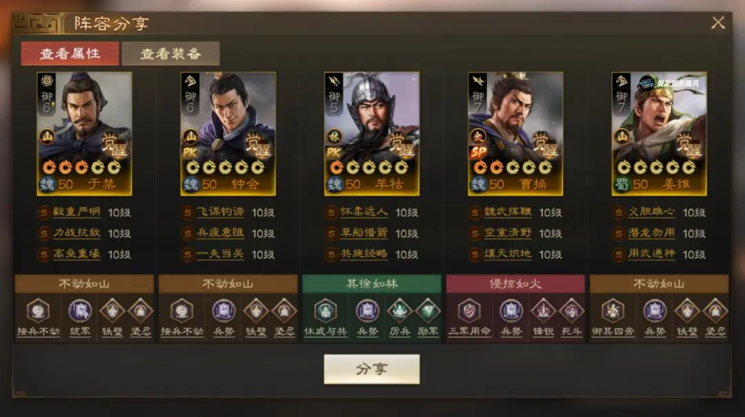 这个队伍前期靠羊祜于禁还有光环苟住,到后期SP曹操和姜维双大哥发力,后期的压制力很强。