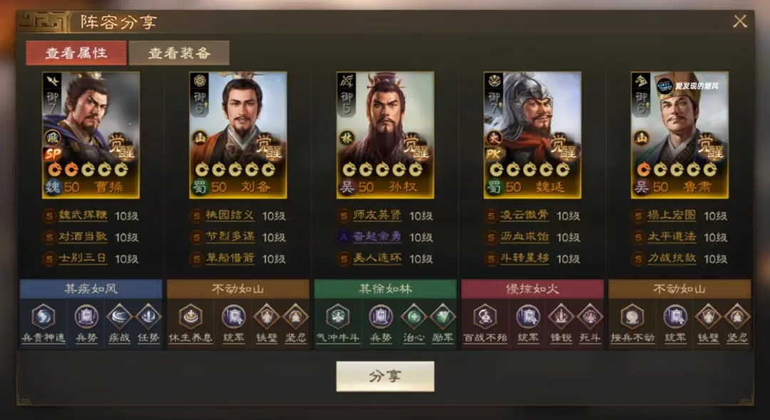 这里SP曹操最好的战法是士别三日+千帆破袭,图上展示的是低配版的,带两个AOE的DOT战法,只要能打到两个单位就能叠满被动。