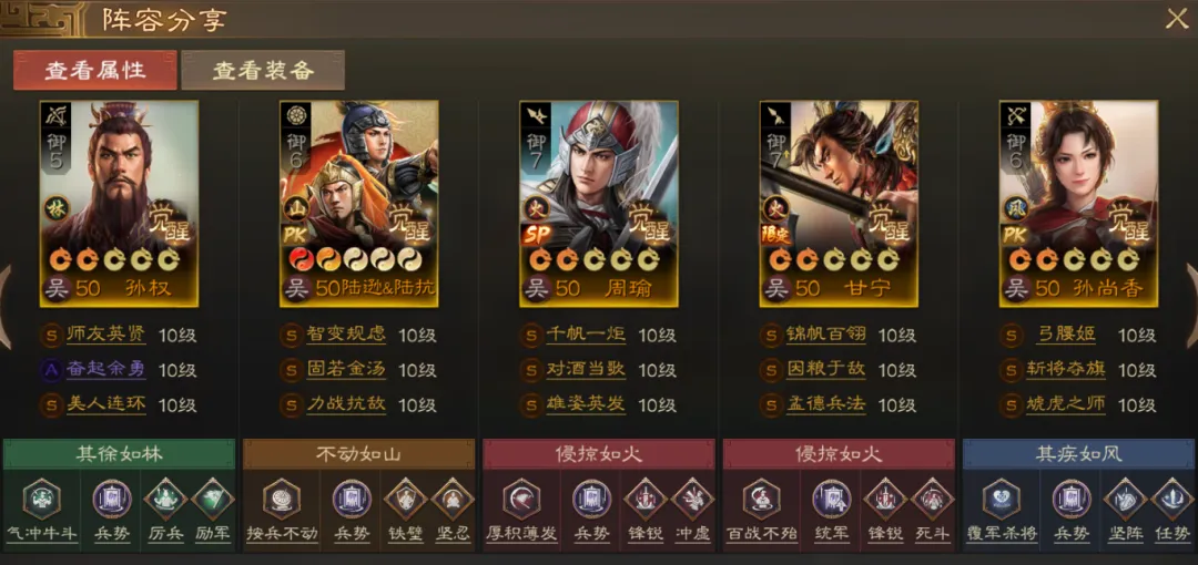 陆逊&陆抗负责保护,这里【固若金汤】可以换为【草船借箭】或者【共施经略】补一下治疗,如果陆逊&陆抗补位的用孙坚带【纵兵劫掠】/【擐甲来援】+【守望相助】/【力战抗敌】。SP周瑜、孙尚香主输出,陆逊&陆抗保护,孙权和SP甘宁辅助增伤。