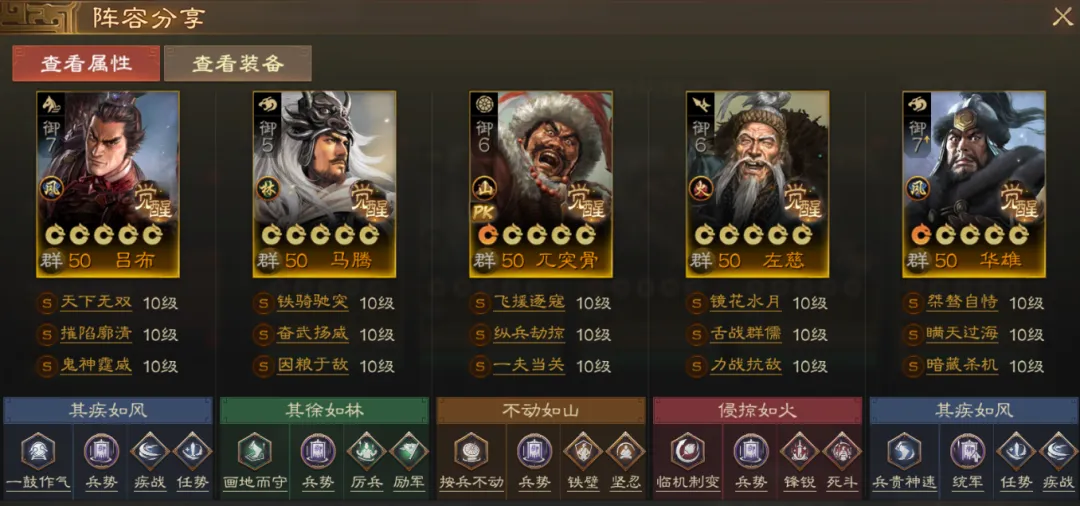 这赛季群骑没法用SP周瑜和徐盛等转阵营角色,好在群雄本身还有华雄能当副C使用,华雄带上【瞒天过海】和【暗藏杀机】,杀了人之后隐身,也不是太怕魏延,和吕布组成秒人双C。这里华雄也可以替换为高览,战法相同。两个工具人还是用兀突骨和左慈,两个非常灵活好用的武将,马腾辅助增伤。