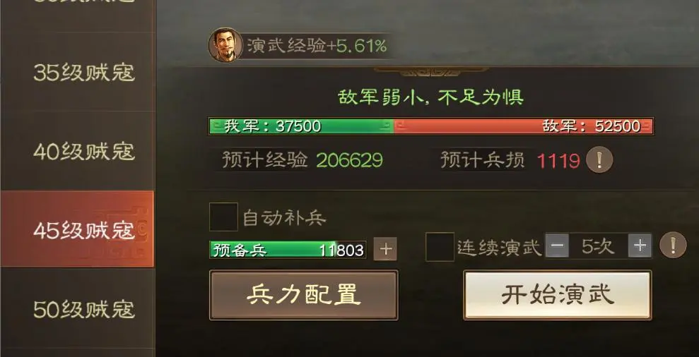 原因是今天霸业推进之后,有45-47级关卡经验+25%,而50级贼寇的经验这赛季是被削弱过的,一加一减之后出现了低等级贼寇经验竟不如高等级贼寇的情况。建议大家这几天都刷45级贼寇就好,体力多战损低的可以用这个连续演武直接扫五次。
