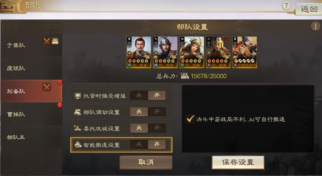 建议每个主力队伍都可以把这个打开,特别你是自动党的话。开启「智能撤退」后,全部输出武将阵亡且兵力悬殊情况下会触发智能撤退以降低兵损。