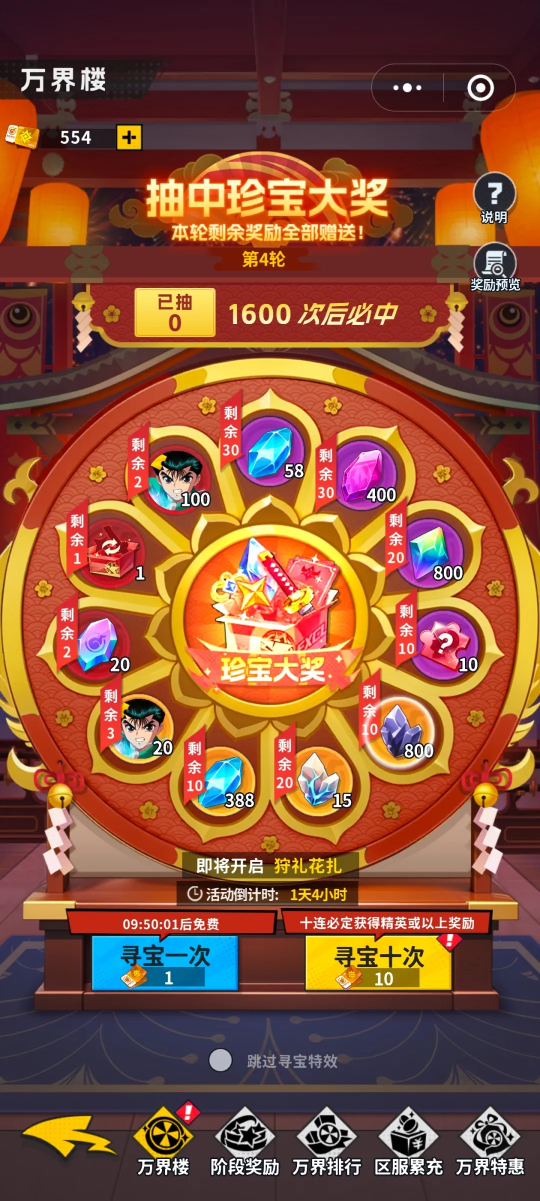 幽游白书宿命觉醒万界楼活动开服第四天开启,会持续三天,玩法简单说就是消耗万界券抽奖,900到1200抽左右可以毕业,看个人运气吧,这个幅度小编出的比较多,辨别欧皇非酋的机会来了,如果说是提前出了自选专武的大奖,其他奖励直接收入囊中!