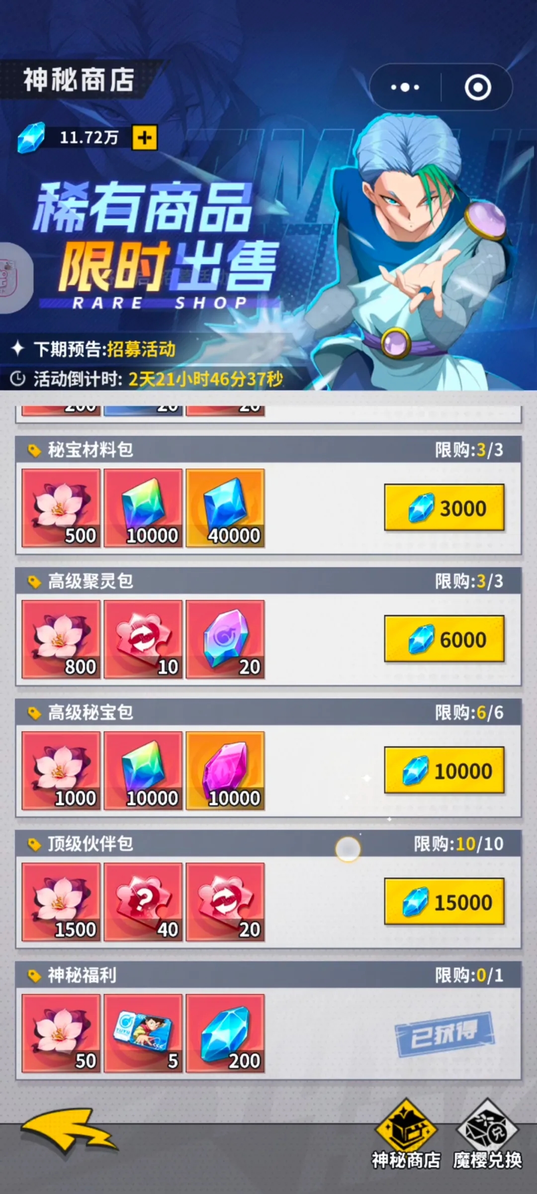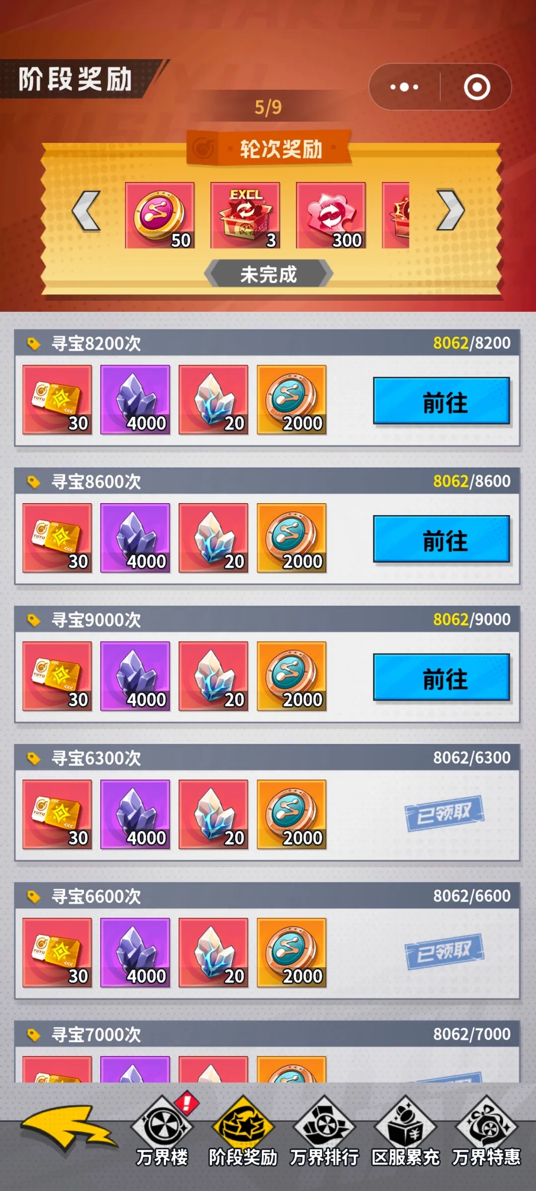 这个平民其实不用消耗钻石,也可以获得很多万界卷,就是主要看自己要不要去拿多一点轮次,这个活动真的非常nice,抽就完了,资源有限,可以看小编上边的轮次角色,去抽自己要的角色,或者去完成有限资源的阶段奖励,领取上边对应的奖励,阶段越高奖励越高,如果说有点氪度的,限时礼包也是非常不错的,而且达到对应的充值金额,也是可以去拿到这个活动的区服累充送的券,也是非常之多,下一个是狩礼花札,会有对应的花札卷,这个活动尽量推塔就完事啦