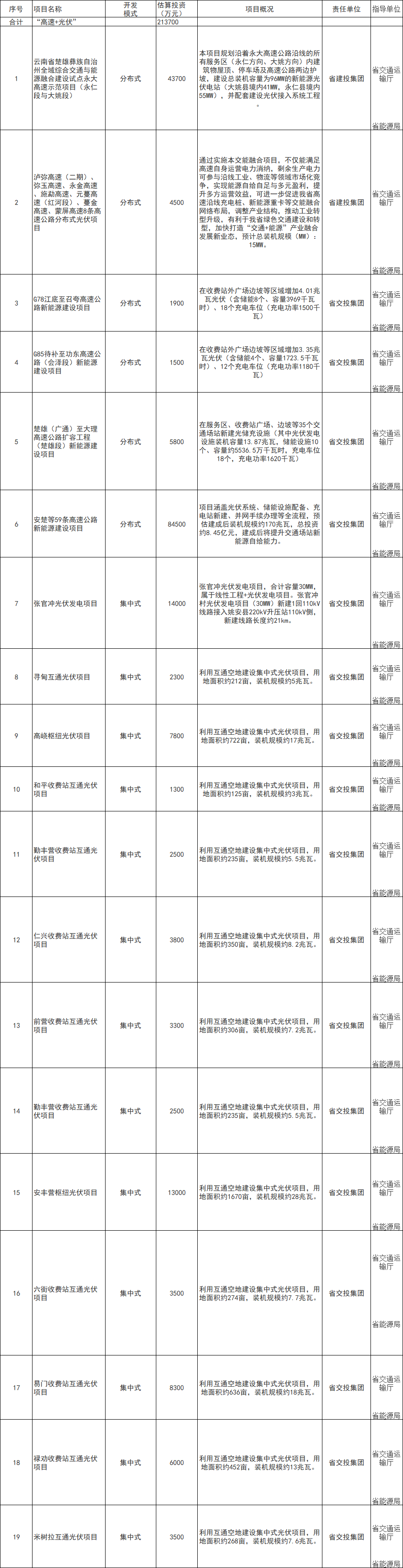 11月25日,云南省第一批“高速+”项目推介清单发布,清单包括“高速+工业”、“高速+文旅”、“高速+光伏”、“高速+物流”、“高速+数智”5个类别82个项目,总投资153.13亿元,为民间资本提供投资参考。其中“高速+光伏”项目19个,估算总投资额21.37亿元。包含分布式光伏项目6个,估算总投资额14.19亿元;集中式光伏13个,估算总投资额7.18亿元。