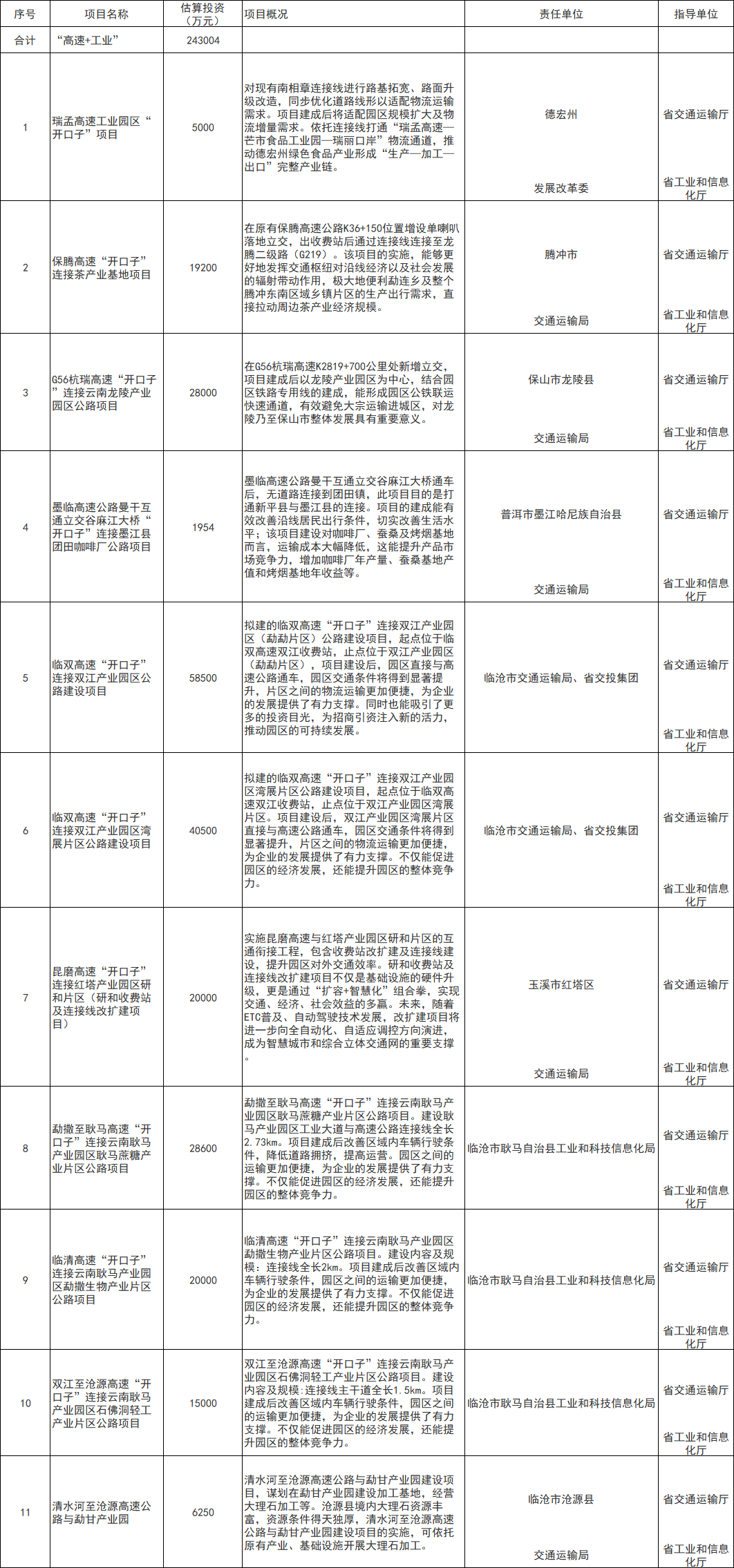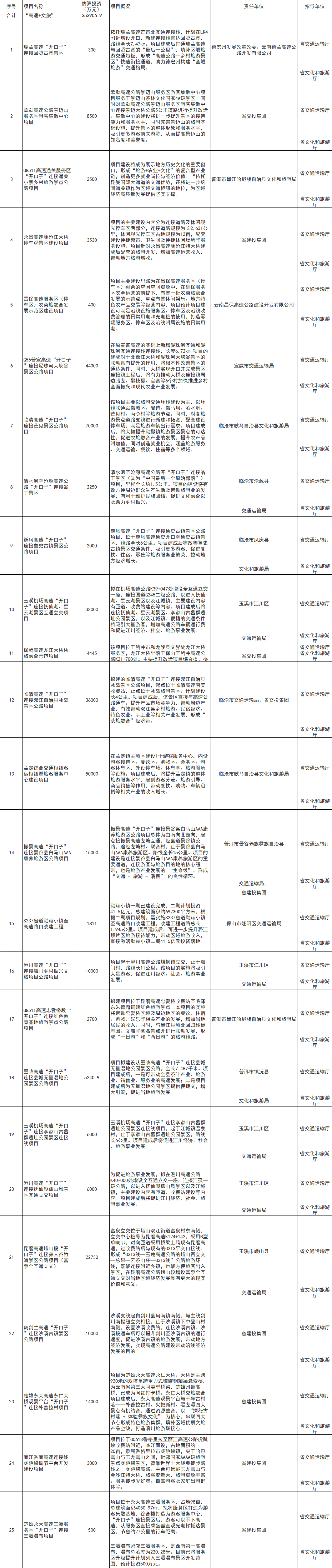 为加快释放《云南省推动高速公路融合发展若干政策措施(试行)》牵引效应,逐步推动高速公路融合发展成型起势,经州(市)谋划、专家评审、部门会商等程序,省发展改革委、省交通运输厅形成了《云南省第一批“高速+”项目推介清单》,现予公布。
