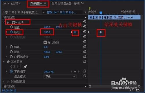 将时间标尺后移至放大结束处,点击“关键帧”图标,建立关键帧,更改缩放值为180%(根据需求修改)
