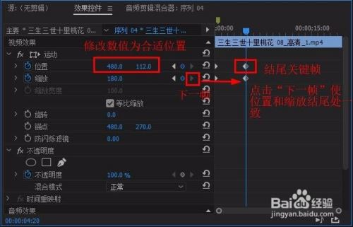 点击“缩放”中的“下一帧”图标,将时间标尺移至结尾处,修改“位置”数值,使放大画面为想要的地方