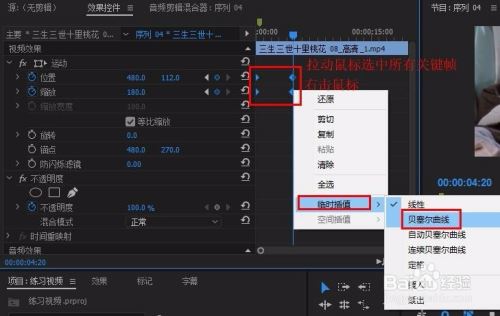 4、拉动鼠标框选中所有关键帧,右击鼠标,选择“临时插值”-“贝塞尔曲线”,完成缓和过渡