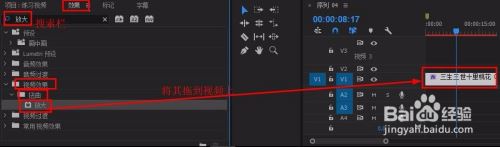 2、在“效果”面板搜索栏输入“放大”,将其拖动到视频上