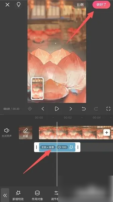 4、点击特效轨道,通过调整操作改变特效时长,让特效与视频内容更好契合,完成后点击做好了选项,导出制作完成的视频。